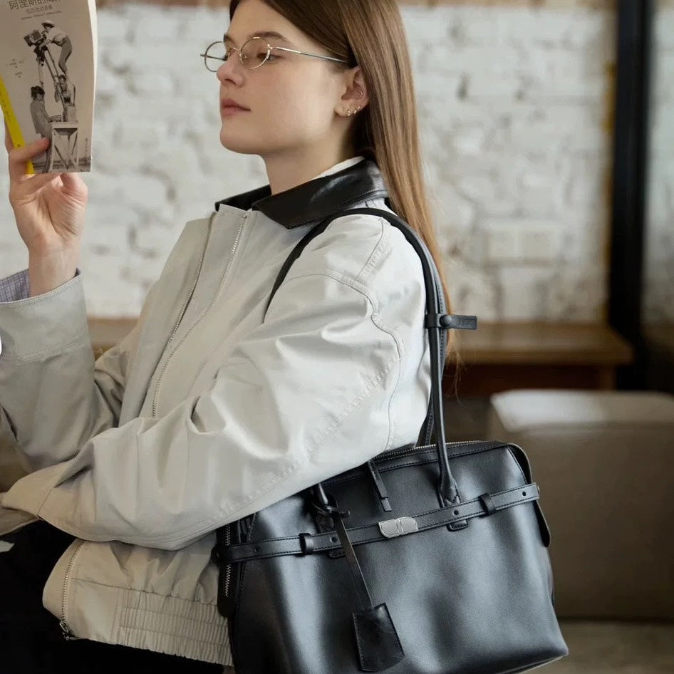 上品さと機能性を兼ね備えた、クラシカルなベルトデザインのトートバッグ。しなやかなフェイクレザーと構築的なフォルムが、洗練された印象を与えます。細ベルトの装飾と付属のIDタグが程よいアクセントに。通勤・お出かけ・カフェタイムなど、どんなシーンにも寄り添う“品格バッグ”です。