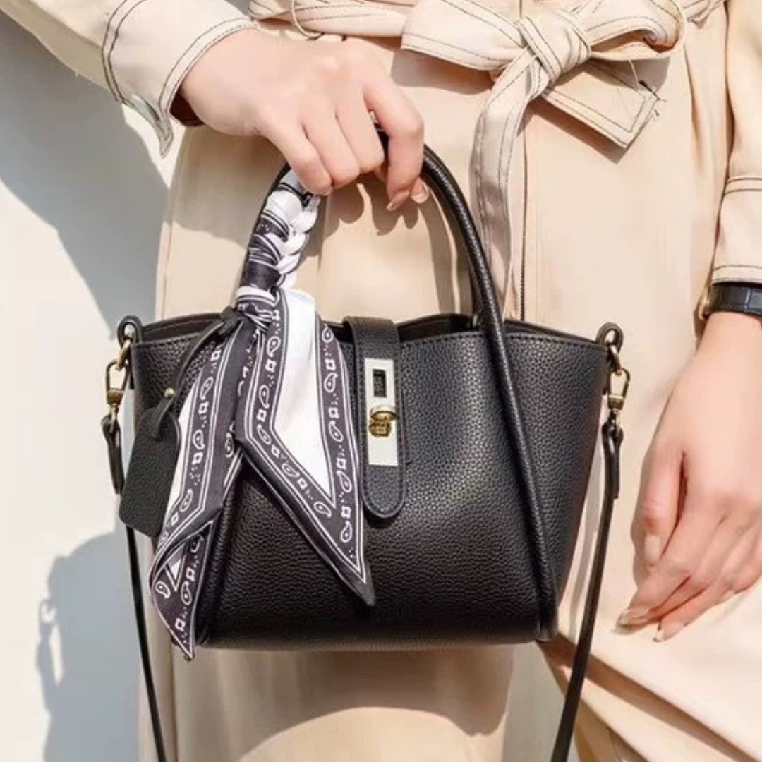 ハンドルに結んだスカーフがアクセントになる、上品で可愛いミニトート。